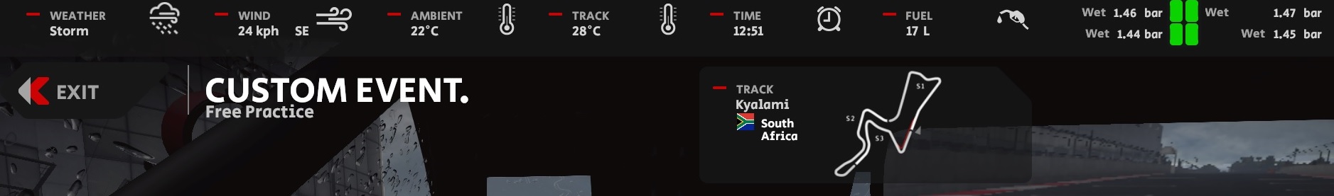 Applicable Settings: Weather - 3 Slot sun / light rain / sun; Race settings: 10min race in friends lobby with AI.
